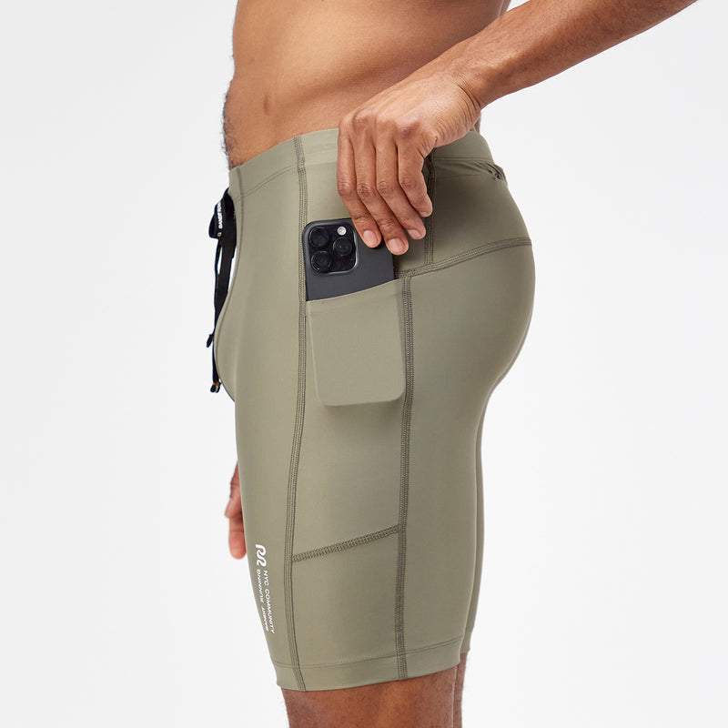 Stamina™ 5" women's compression shorts with dual anti-bounce side pockets, zippered stash pocket, grip tape, and custom waistband. Stamina™ 5" women's compression shorts with side pocket holding smartphone.