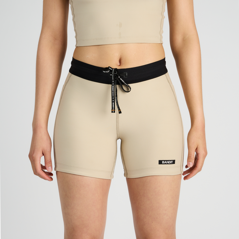 Cadence™ 5" Women's Compression Shorts in beige with black waistband, featuring anti-bounce side pockets and zippered stash pocket. Cadence 5" women's compression shorts with side pocket for phone.